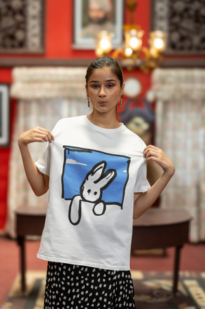 Featuring a DTF-printed dual-tone rabbit design, this tee stands out with its artistic hand-pulled finish that adds a hint of playfulness and charm. The detailed print brings a touch of creativity while keeping the vibe subtle and chic — perfect for women who love expressive, minimal designs.