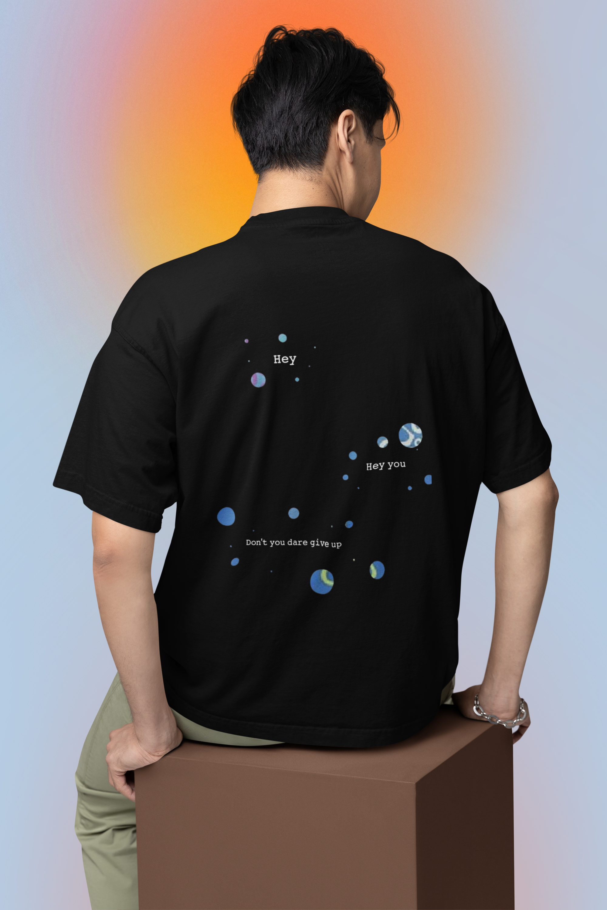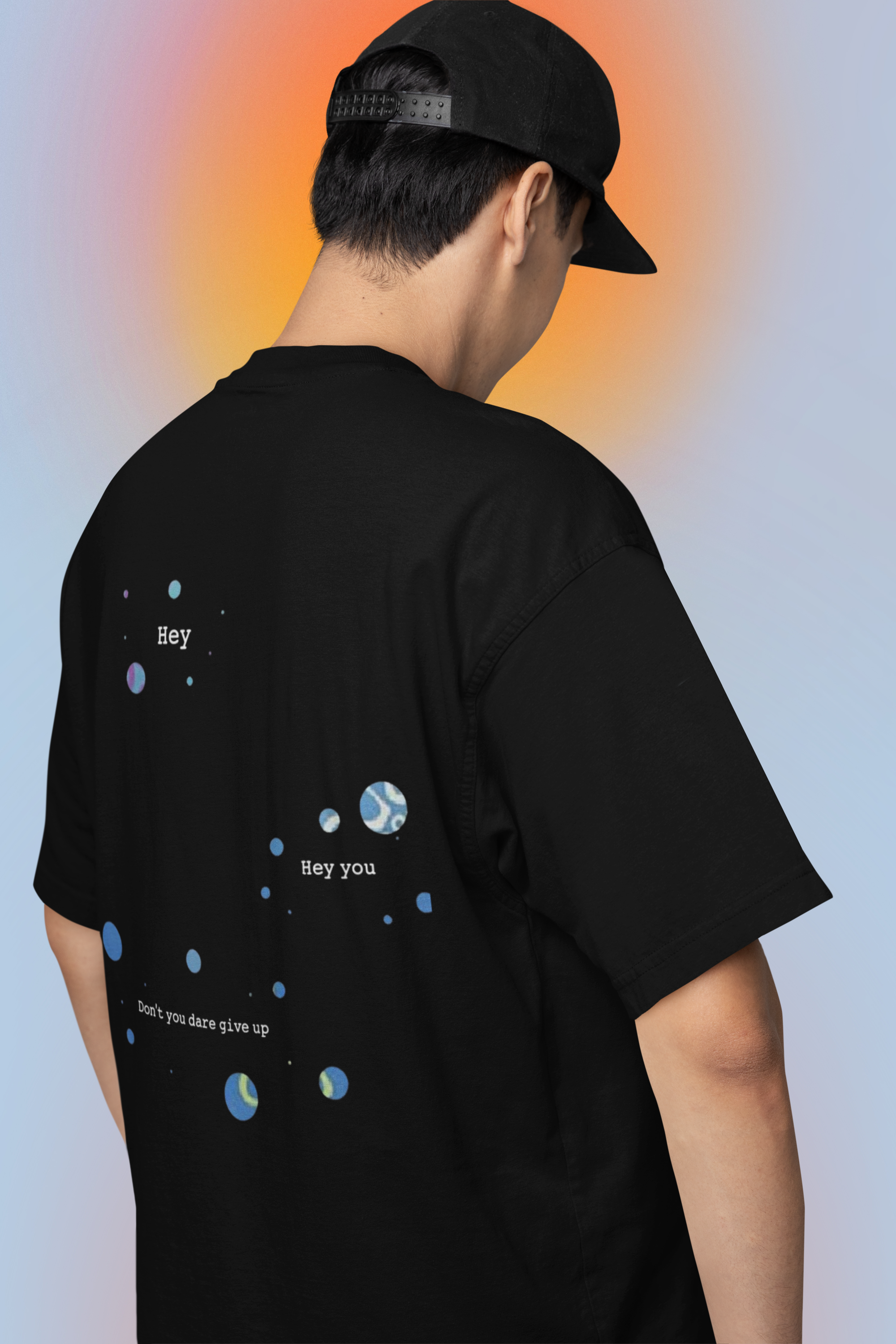 The back features a serene and motivational DTF-printed design with scattered cosmic bubble elements and minimal text that reads: