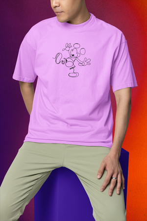 Playful meets bold in this oversized men’s tee featuring a vintage-style Mickey Mouse back print on a soft lavender base. The muted pastel shade paired with the iconic character artwork gives this tee a standout streetwear vibe while still keeping it wearable and versatile.