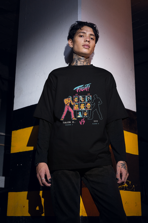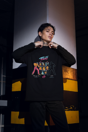 The DTF-printed retro fight game design brings back the old-school arcade vibe with pixel-style characters, bold colors, and classic gaming energy. It’s the perfect graphic t-shirt for men who grew up on vintage games and love a fun, statement streetwear piece.